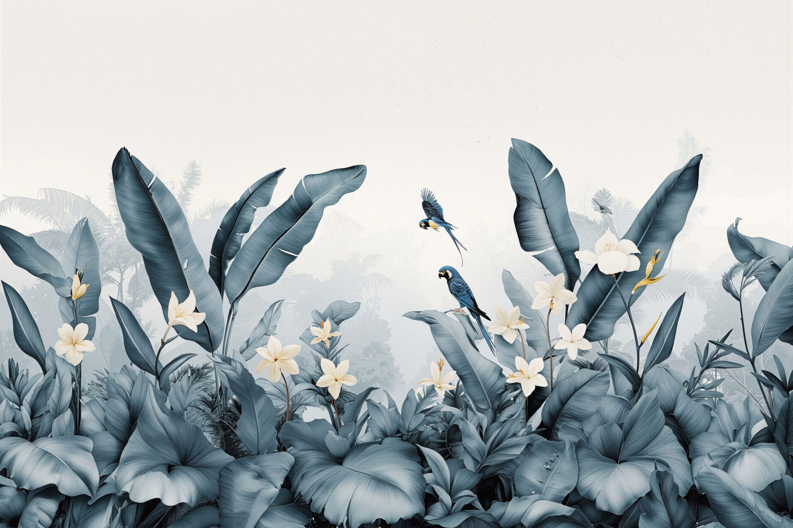 Elegant blue botanicals with golden-beaked parrots evoke a calm, exotic retreat wrapped in mist and morning light.