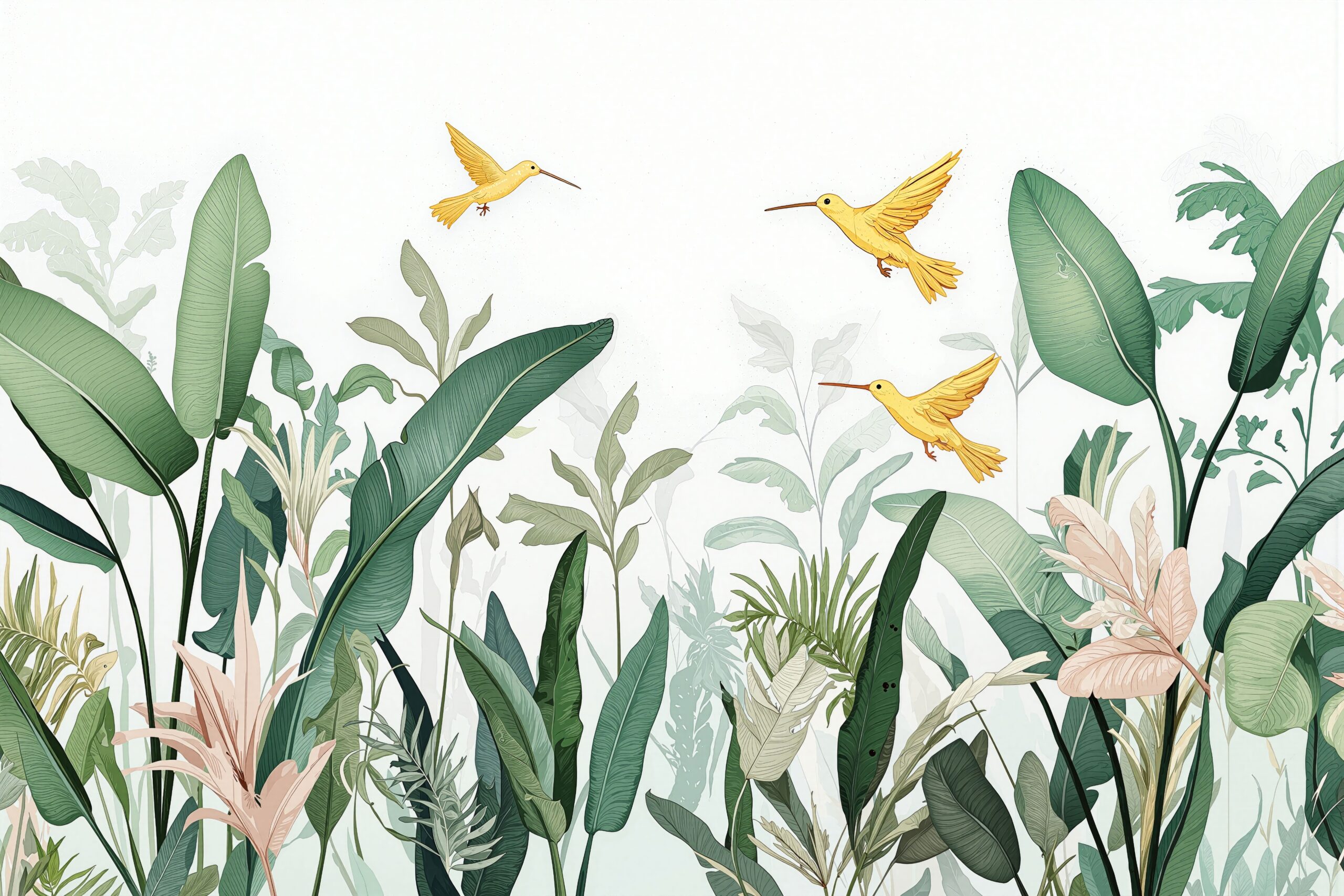 Delicate hummingbirds dance through lush greenery—an uplifting mural that feels serene and full of wonder.