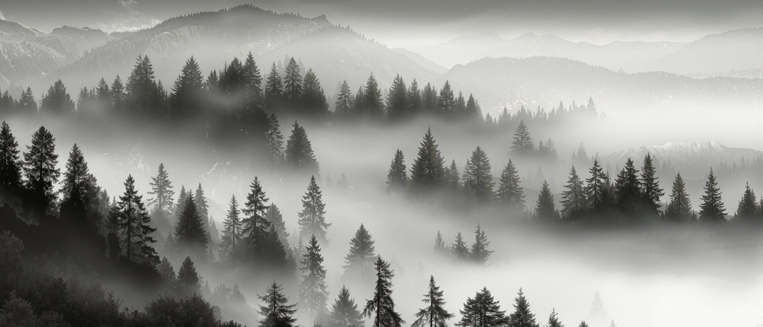 Stark silhouettes of firs drift through rolling mists—haunting, still, and sublime.