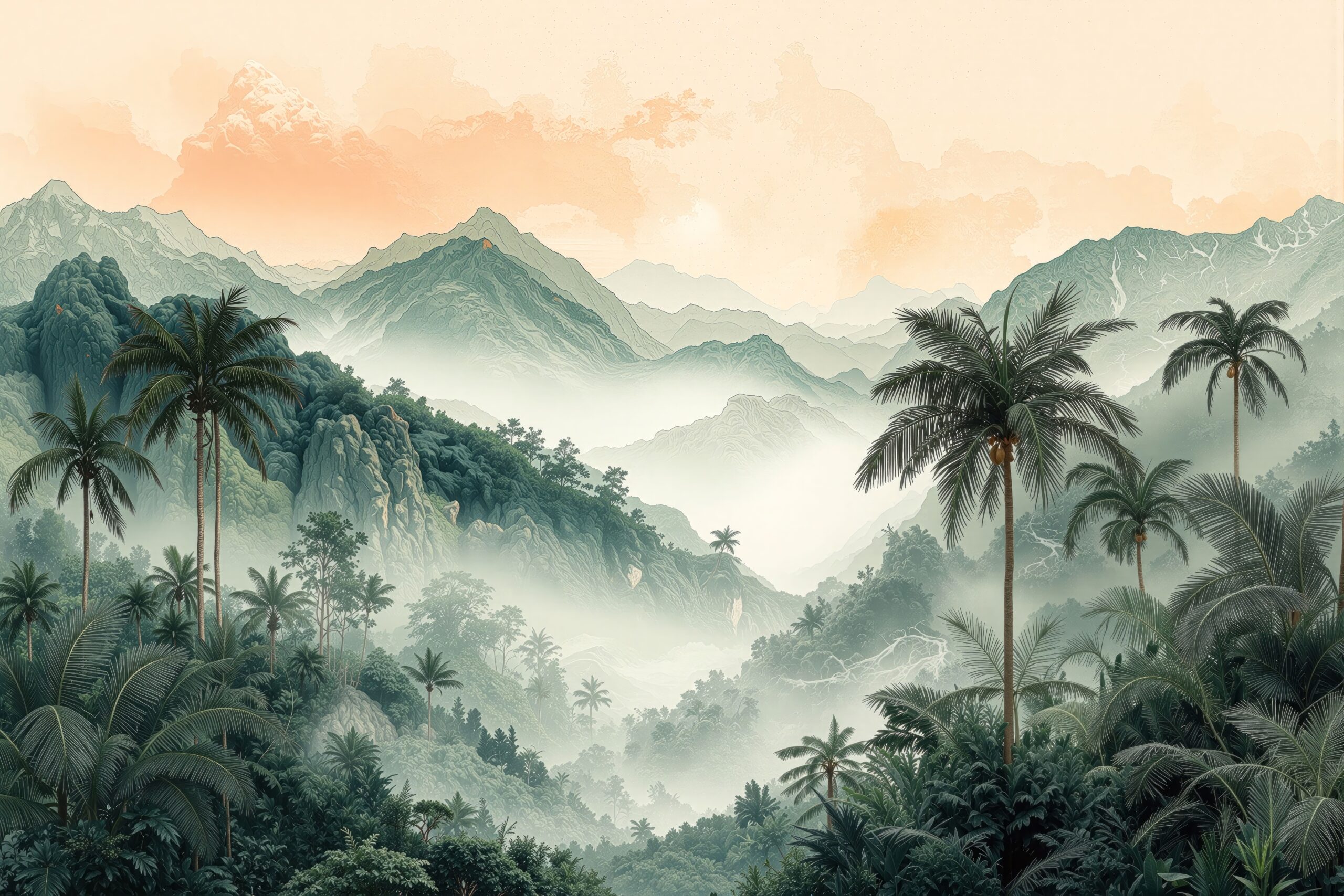 Lush palms frame mist-kissed mountains under a peach-hued sky—this mural radiates tropical grandeur and morning calm with elegant, layered depth.
