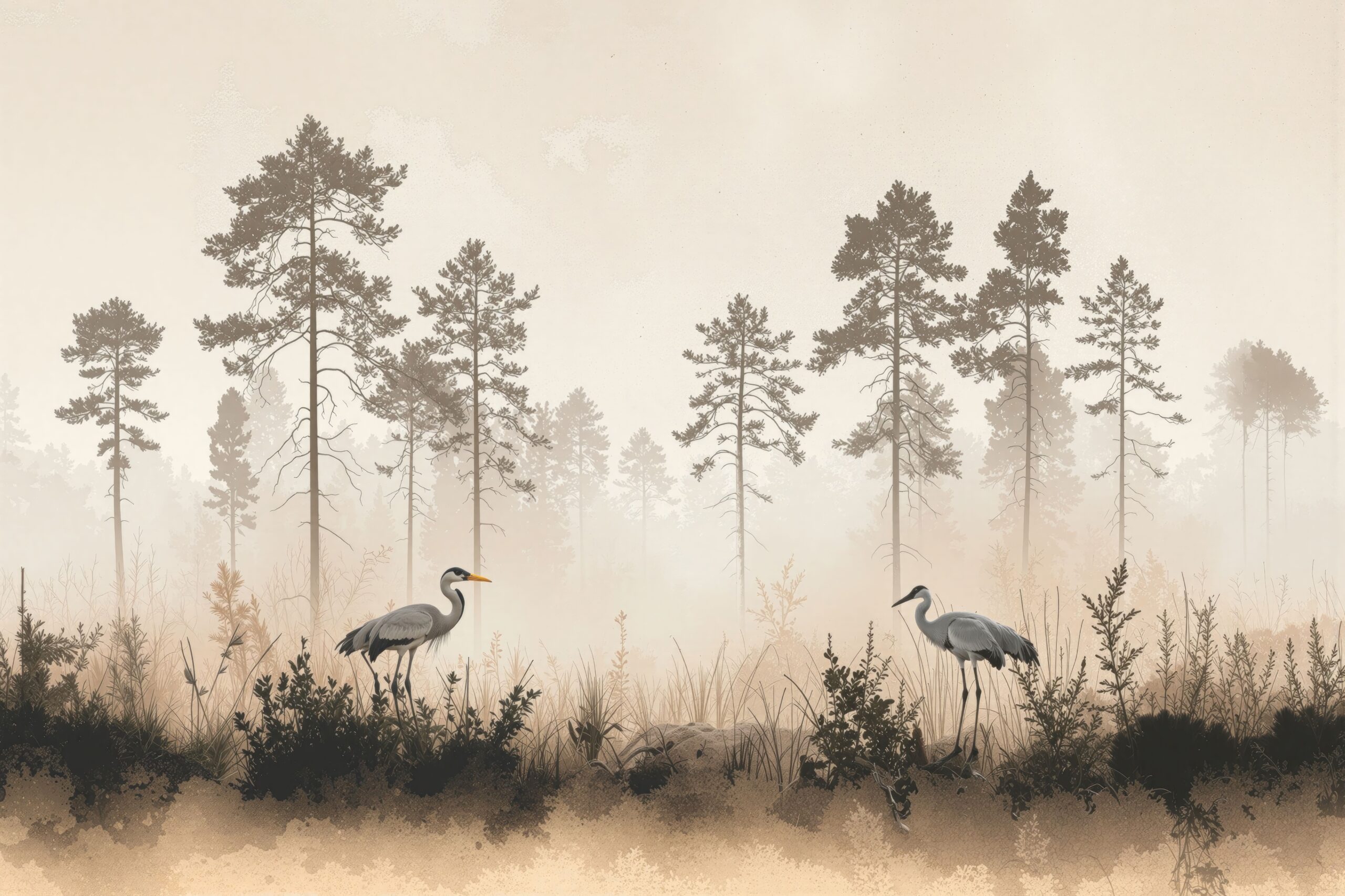 Ethereal mist weaves through tall pines as elegant cranes wade silently—capturing nature’s stillness in a serene, minimalist mural perfect for tranquil spaces.